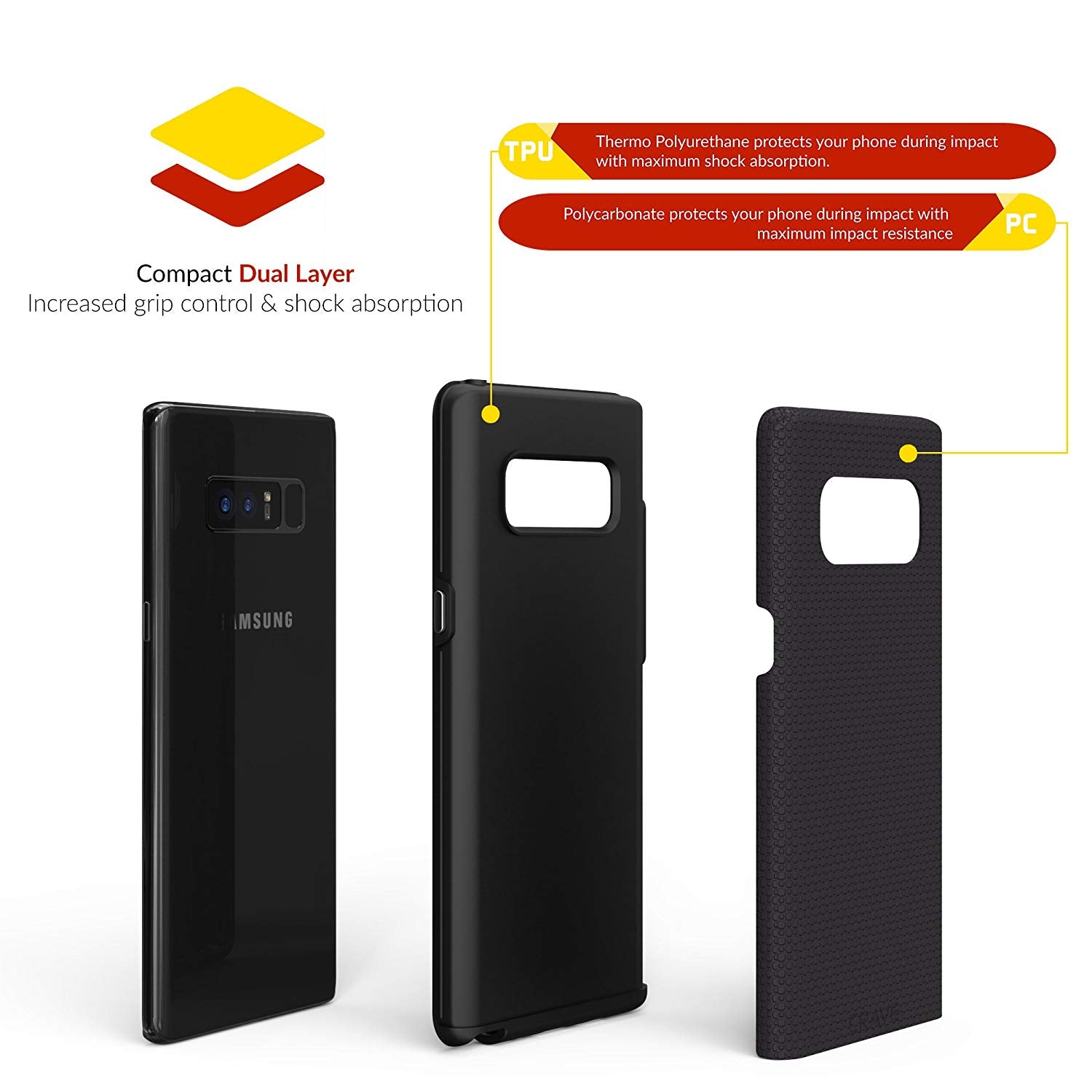 ADVANCED DUAL LAYER PROTECTION: The Crave Dual Guard Samsung Galaxy Note 8 Case is designed with dual layer technology that protects your cellphone from drops and shocks with a layer of high-grade polycarbonate (PC) and one of thermo polyurethane (TPU).